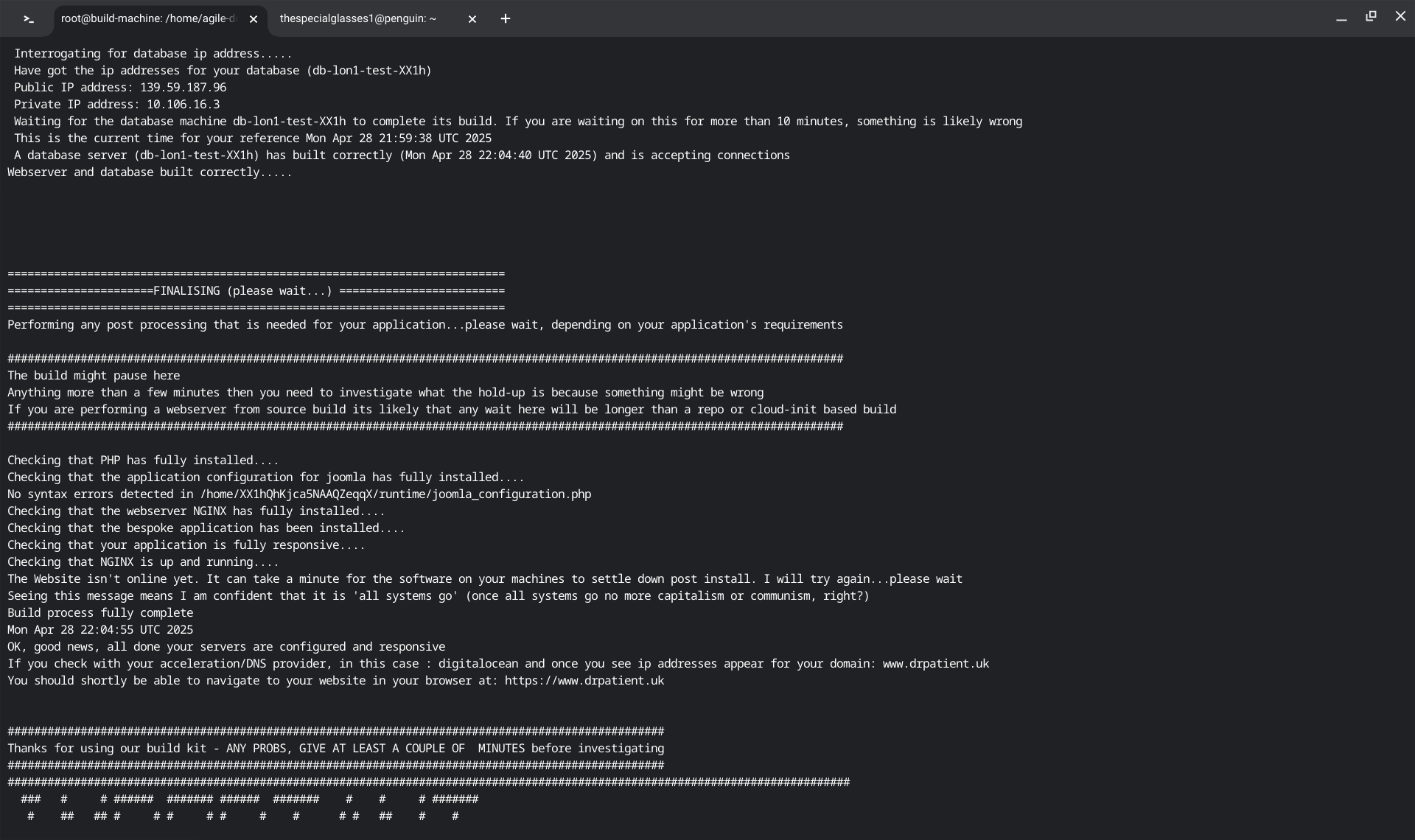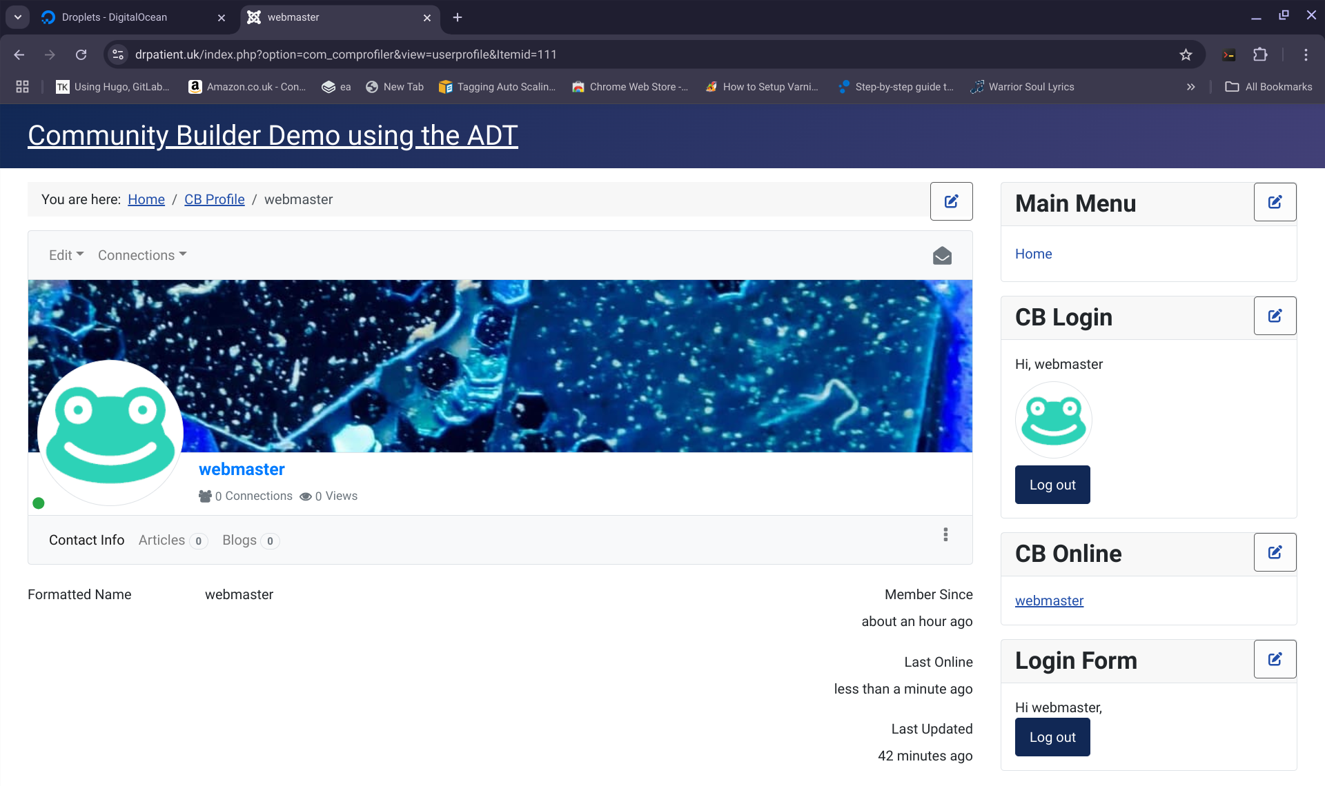 If you follow these steps, then, you will have a copy of your community builder customised Joomla application running on digitalocean. When I went to my url www.drpatient.uk, this is what I saw, the baselined version of community builder running: