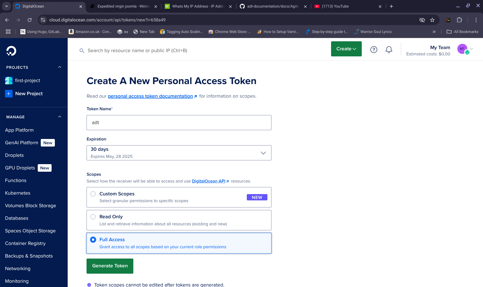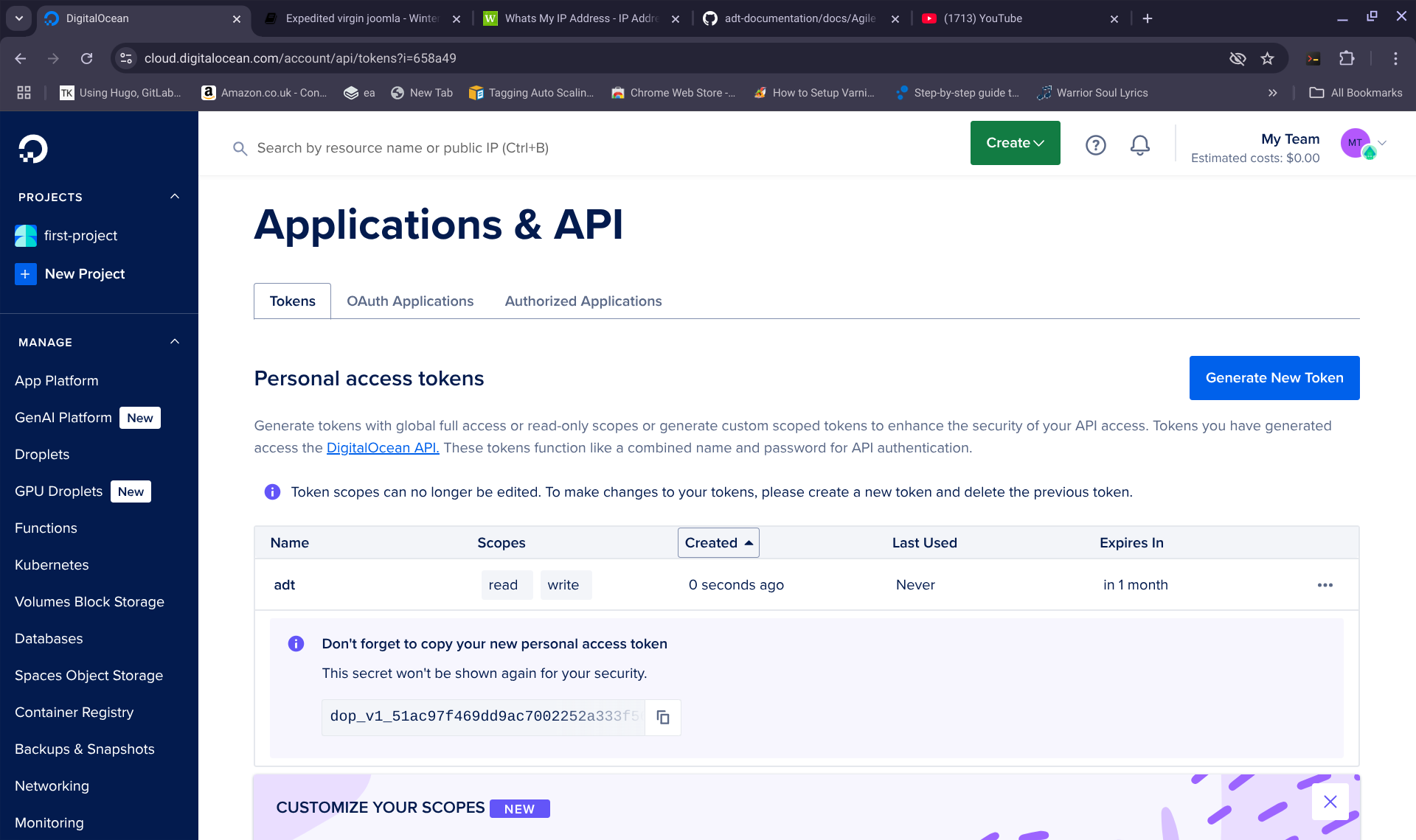 In production use you should use the principle of least privileges to generate 2 different access tokens, one token for compute and one token for DNS scope, but, to make this tutorial simple we can just generate one token with permissions for both scope sets.