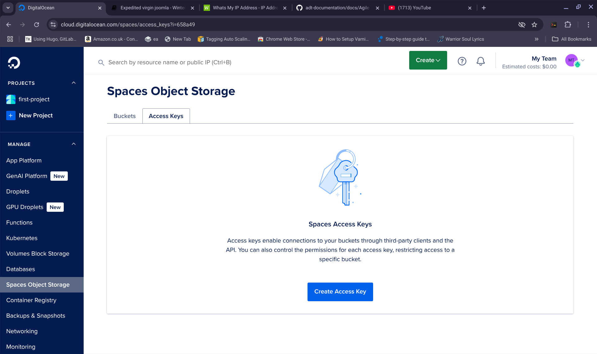 Now you need to generate an access key and a secret key for Digital Ocean Spaces which is the S3 compatible object storage offering from Digital Ocean How to generate your access key and your secret key is shown in the following images: