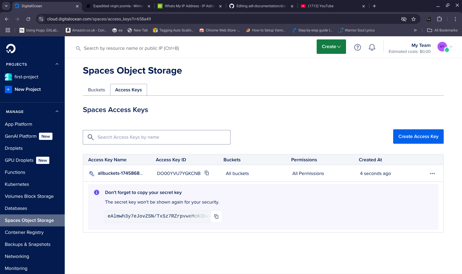 Now record your spaces secret key and your spaces access key in the text file on your laptop