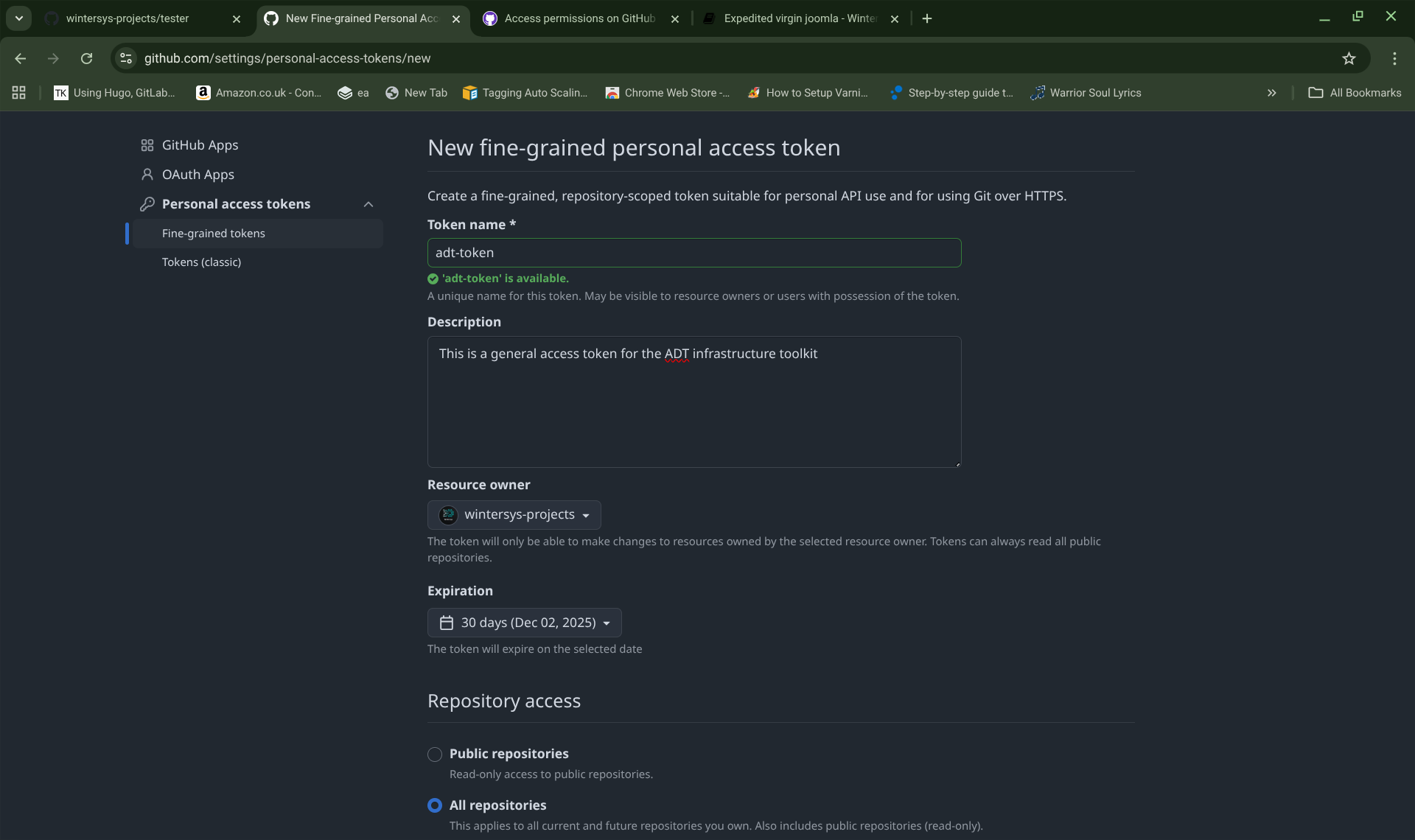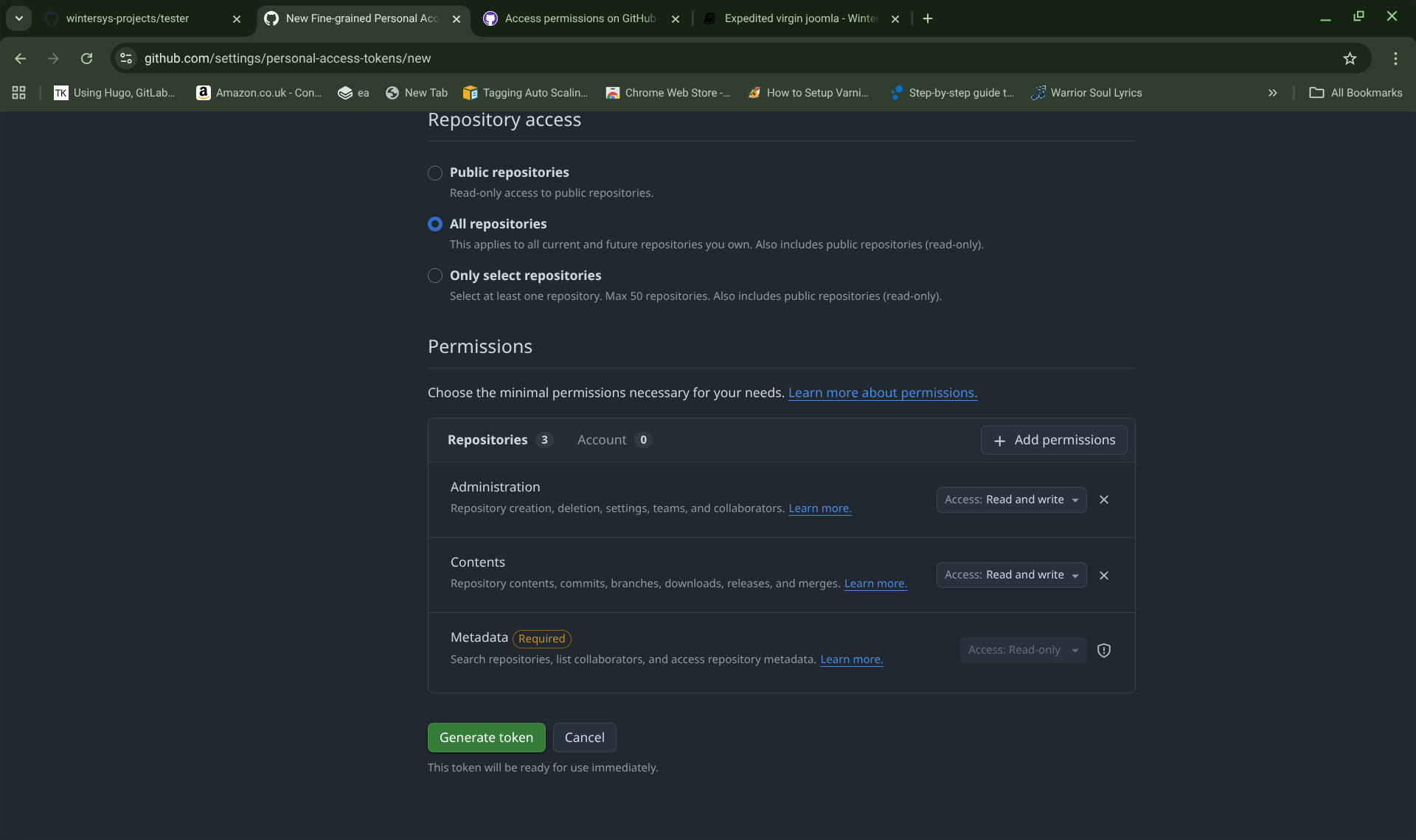 (your personal access token must have enough privileges to create repositories which means the "administrator" and "contents" options need to be set to read/write. Only setting these two values follows the principle of least privileges)