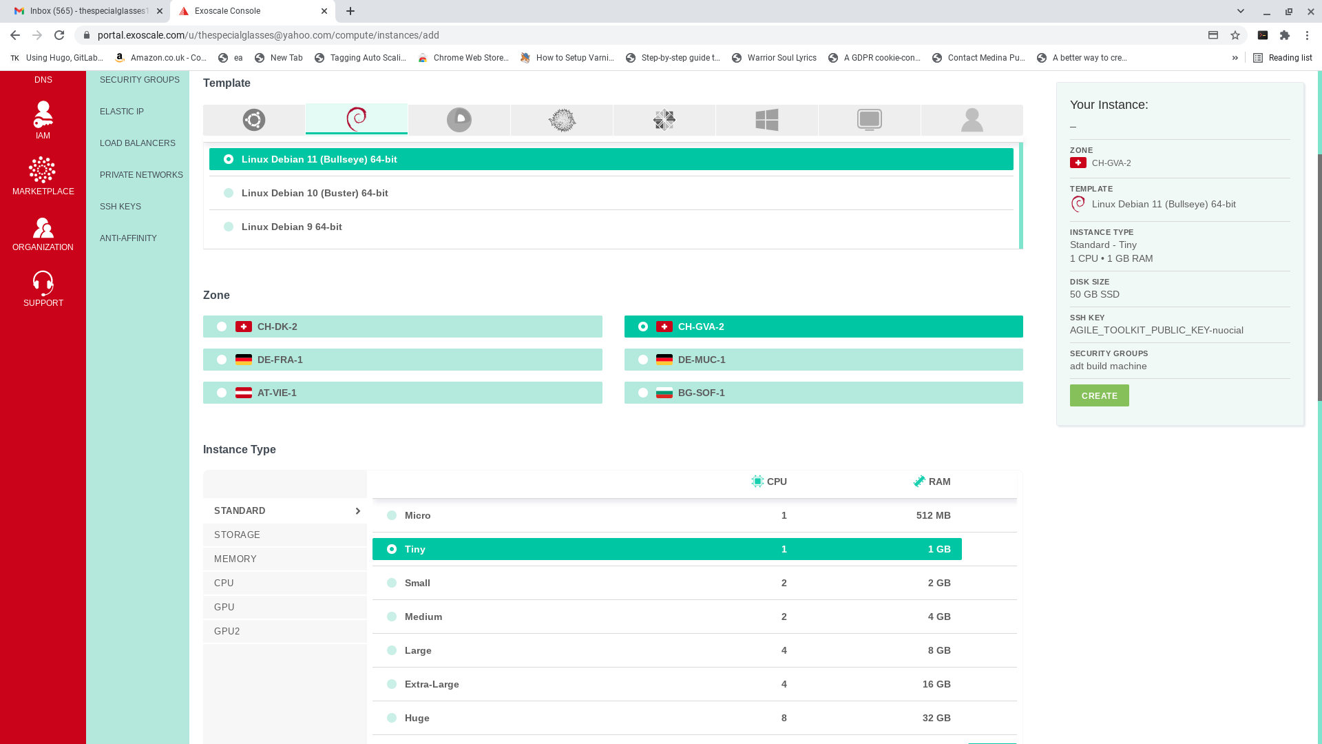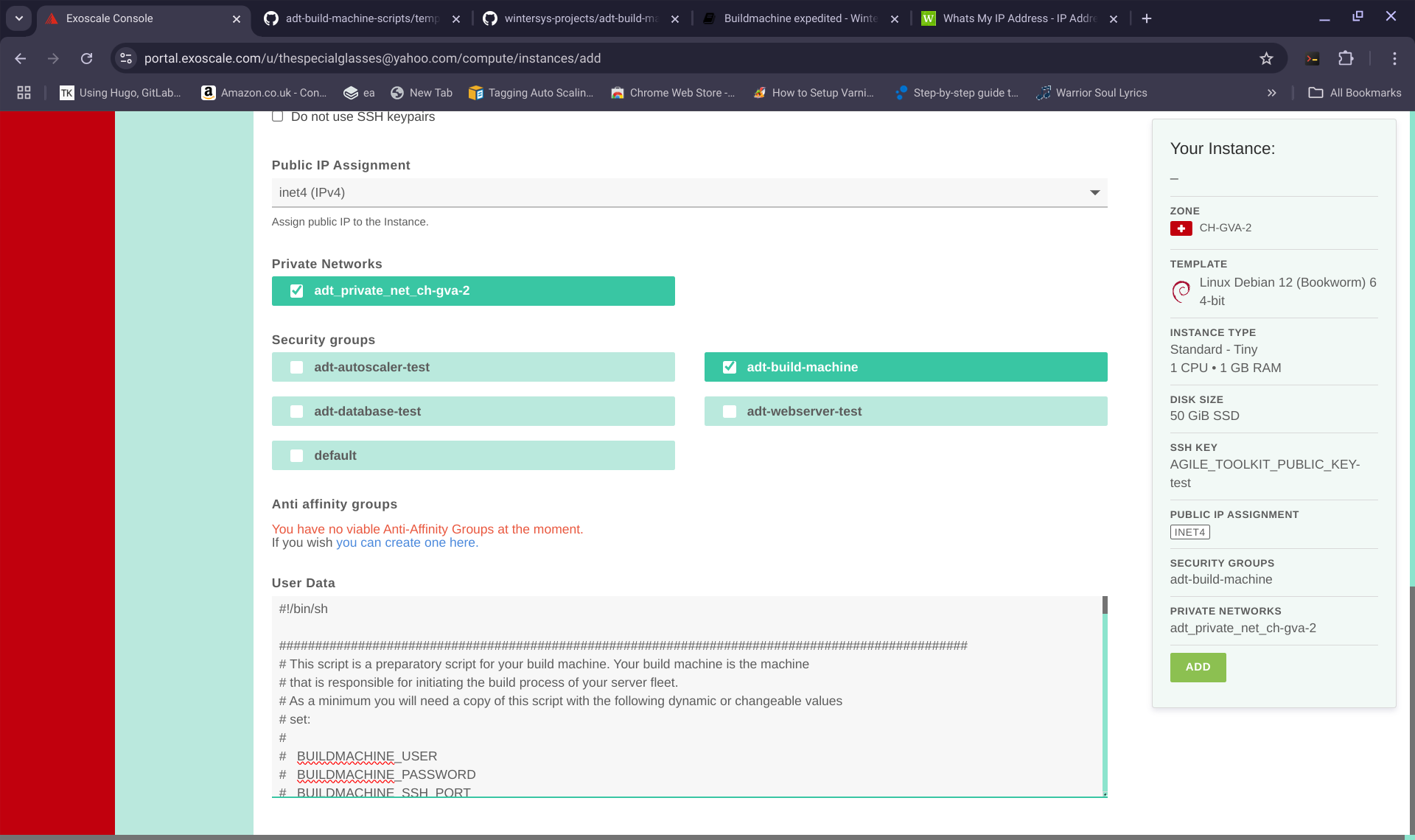 1. Select which template you want debian 12 or ubuntu 24.04 2. Select which zone you want to deploy to, for example, CH-GVA-2 3. Select instance type "Tiny" for example 4. Select disk size (50GB) 5. Add the build machine to the "adt_private_net_ch-gva-2" security group 6. Ignore the SSH KEY in the GUI (the system will get this from the "SSH" value that you pasted into your user data script above) 7. Make sure your build machine is added to the security group "adt-build-machine" and deselect the "default" security group if it is selected. 8. In the "User Data" area of your VPC machine, paste the entire script that you were left with from 4. 9. Click Create and wait for your machine to build