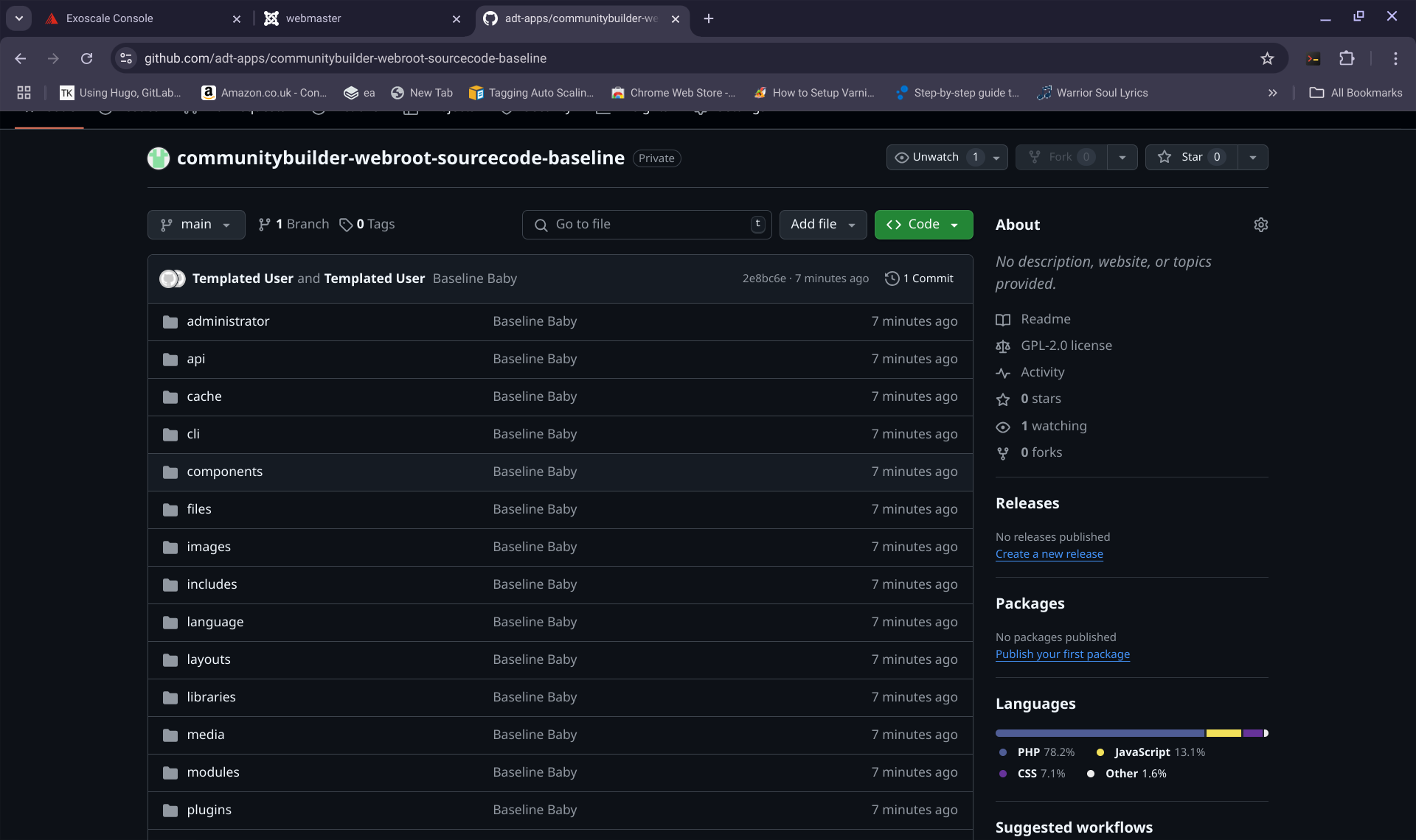 Take 5 minutes to install Community Builder onto your new Joomla application. Once you are happy with what you have built, you need to make a baseline of it. The baseline will be written the github account that your template is set to use, in my example, it is my "adt-apps" github account yours will be something different.