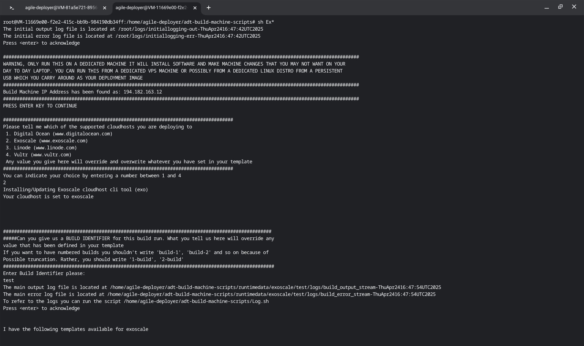 If your template is configured correctly you can now run the build process selecting the appropriate template and cloudhost (exoscale and template 2 in other words). On your build machine, do as follows: