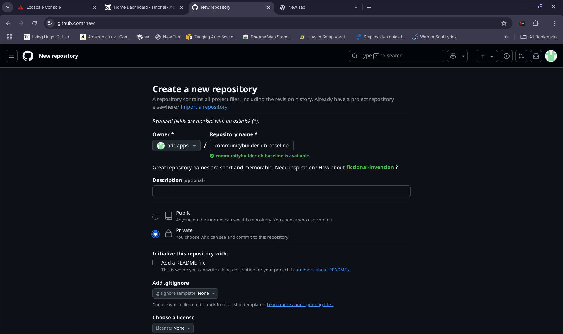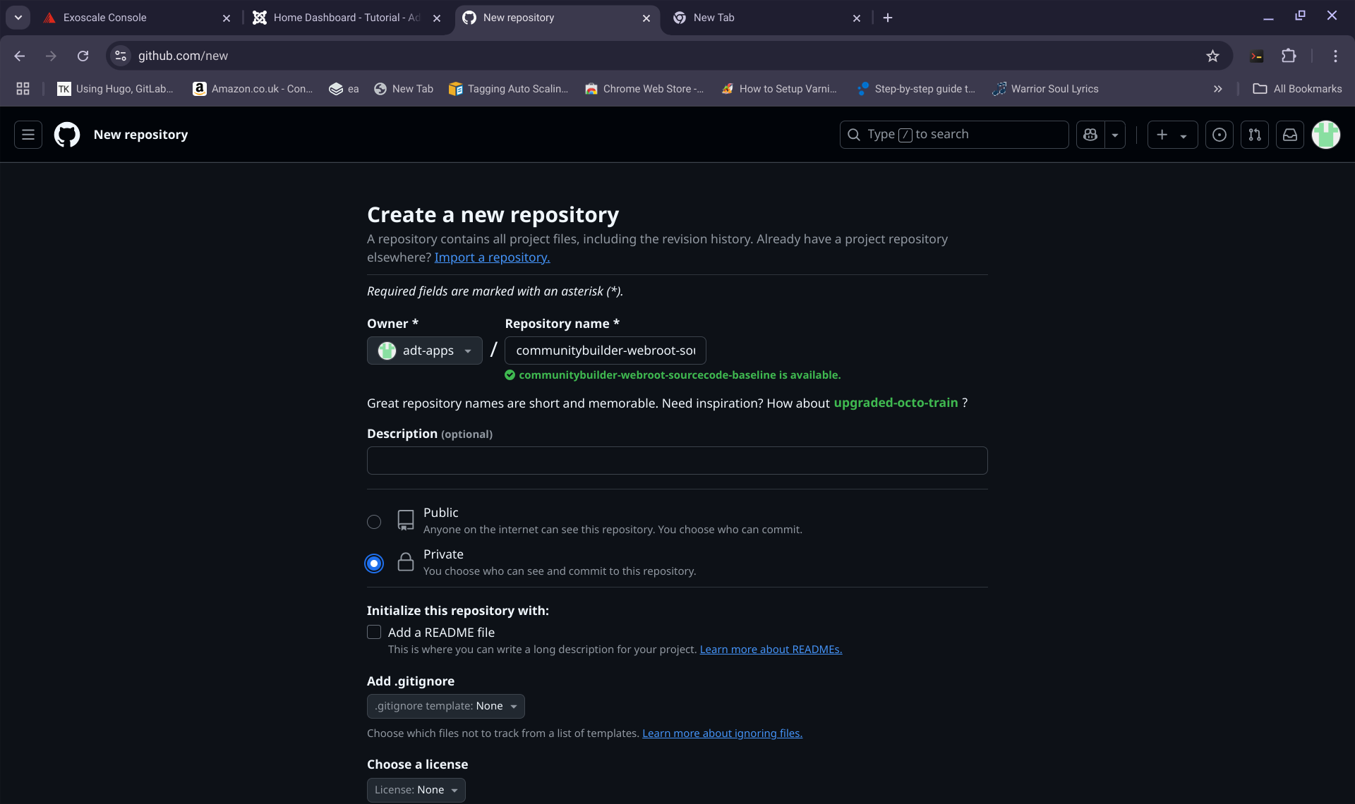 - Go to you git provider account console with your browser, in this case it is my "adt-apps" account with Github and create two private repositories with the following names: