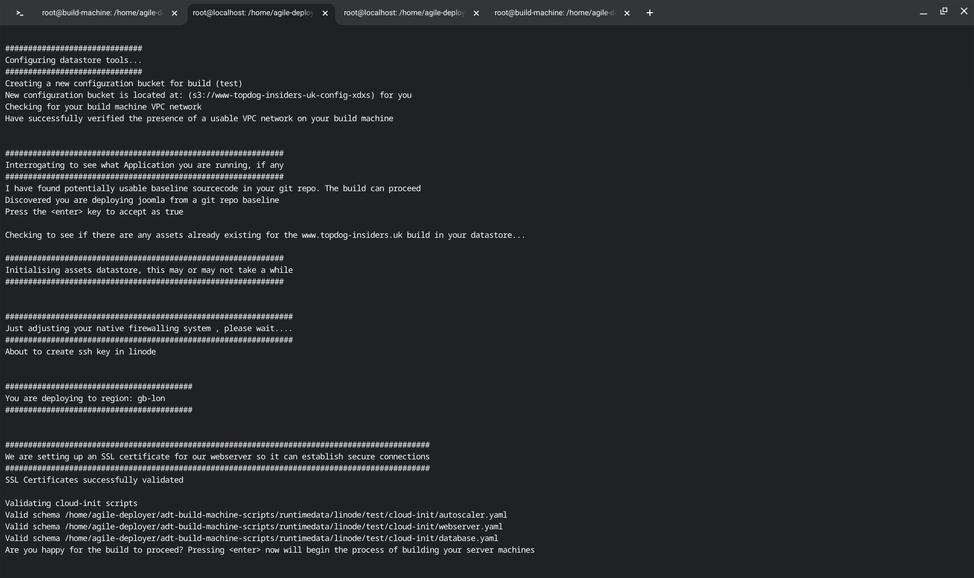 If your template is configured correctly you can now run the build process selecting the appropriate template and cloudhost (linode and template 2 in other words). On your build machine, do as follows: