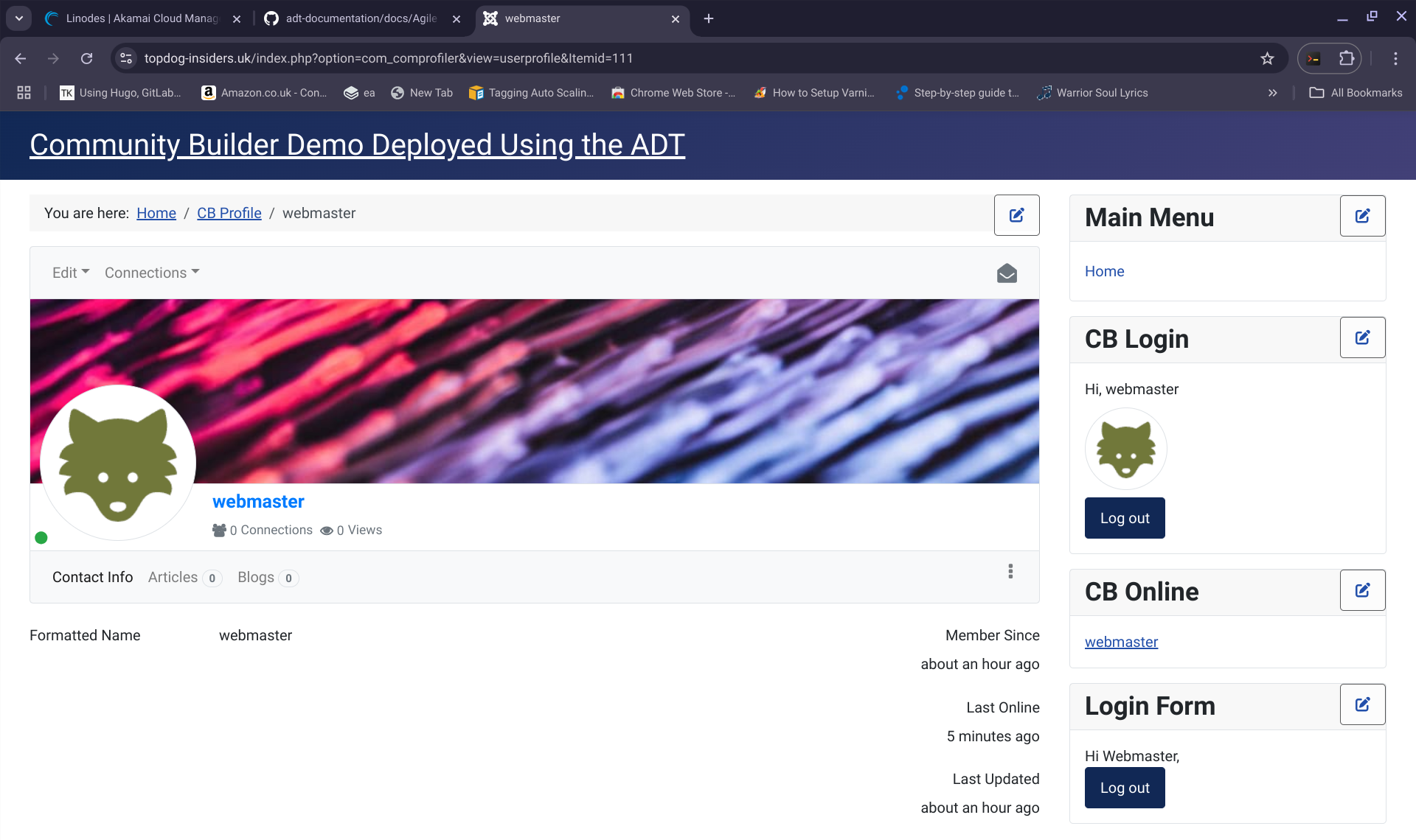 If you follow these steps, then, you will have a copy of your community builder customised Joomla application running on linode. When I went to my url www.topdog-insiders.uk, this is what I saw, the baselined version of community builder running: