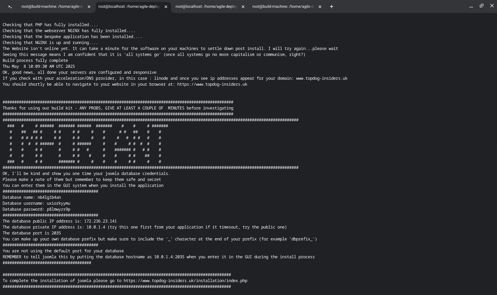 You will then need to answer the questions that you are asked and in a few minutes you should be able to install joomla using the GUI system of your browser. Please note, the credentials,port,database IP that you need to enter into the joomla GUI will be shown at the end of the build process.