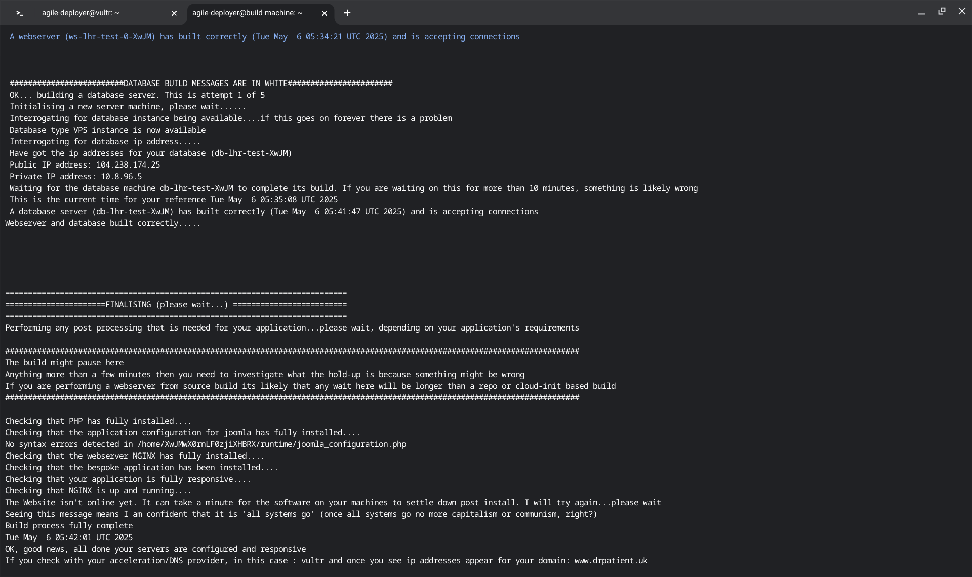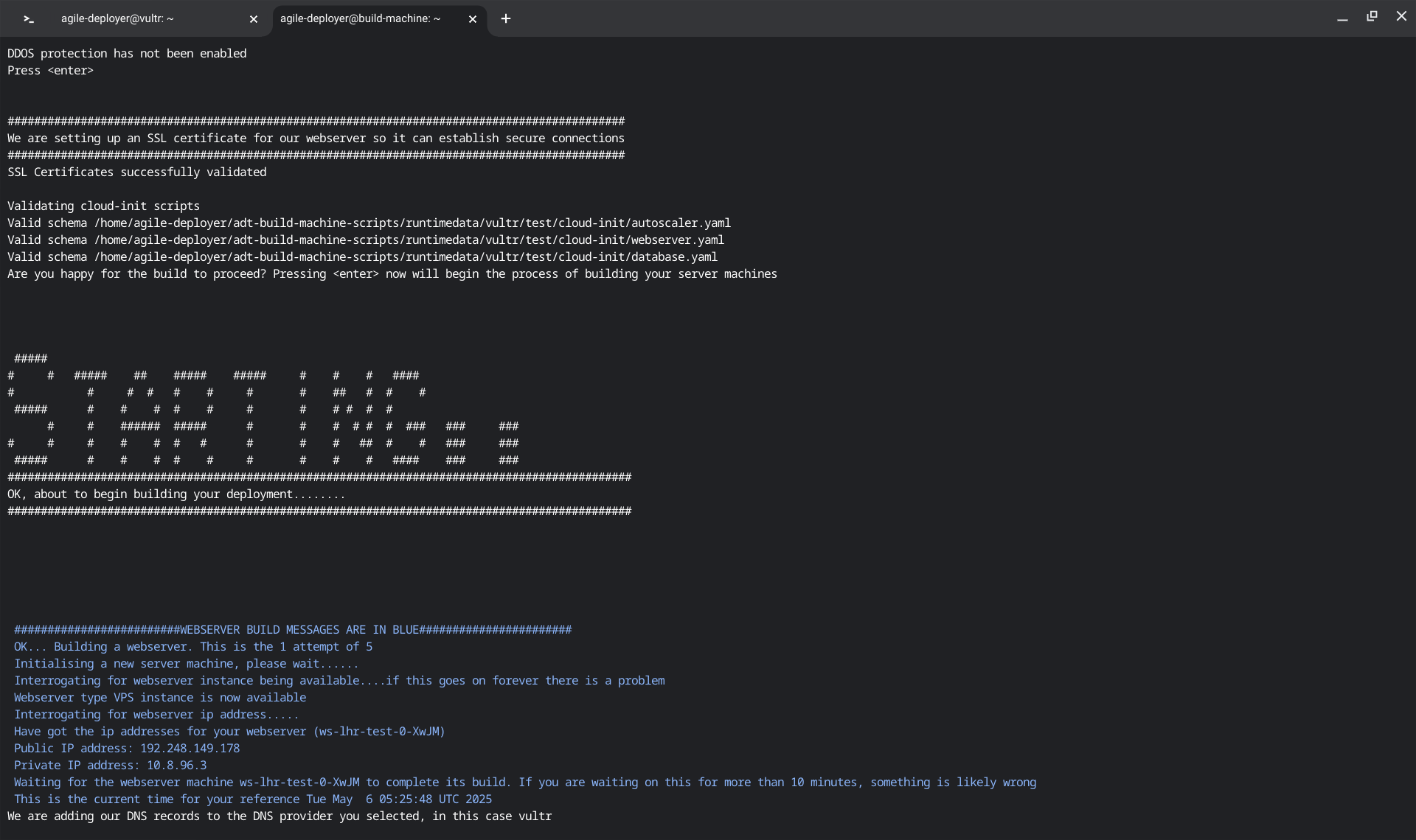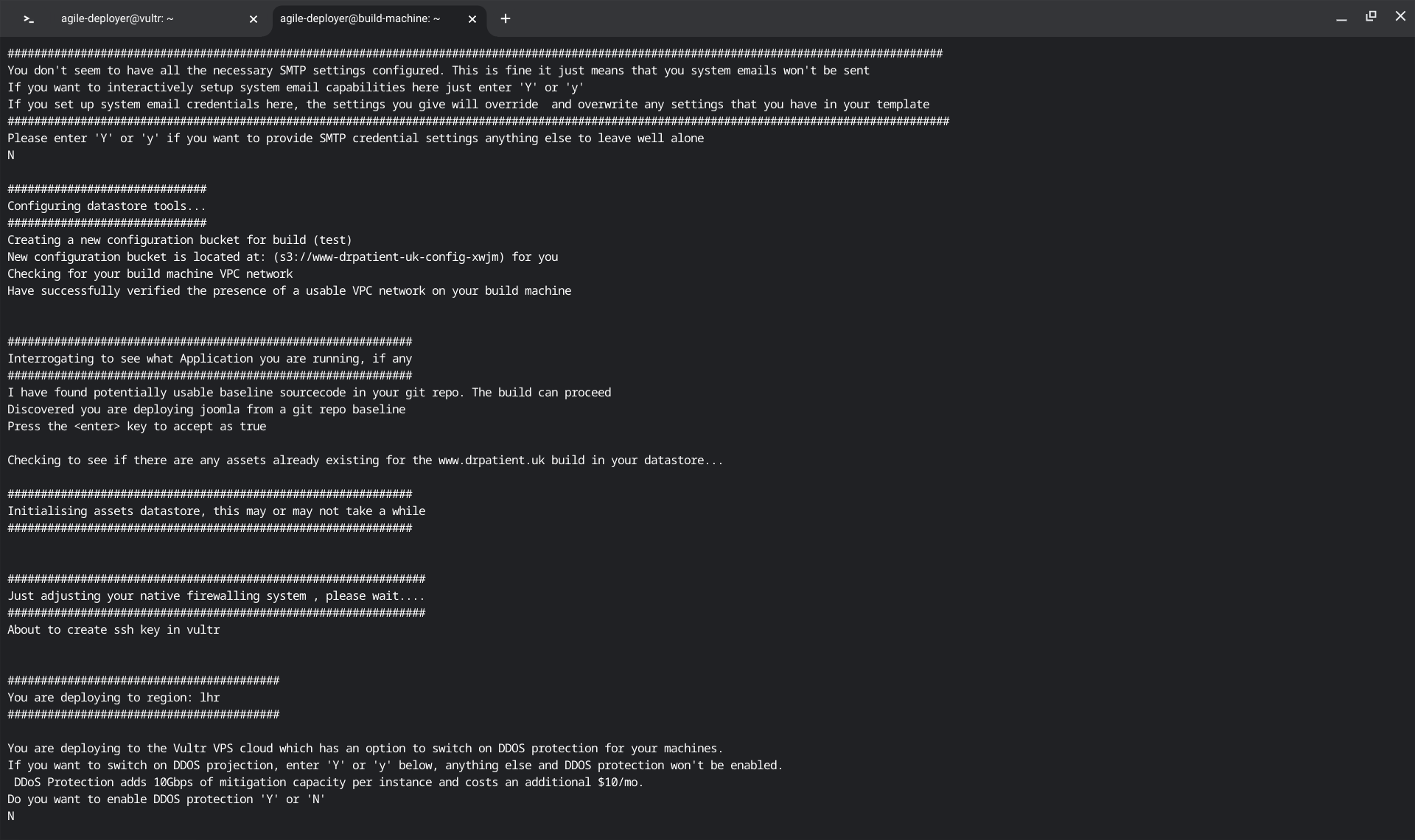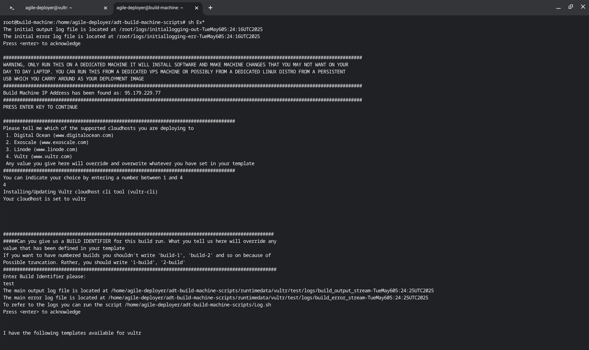 If your template is configured correctly you can now run the build process selecting the appropriate template and cloudhost (vultr and template 2 in other words). On your build machine, do as follows:
