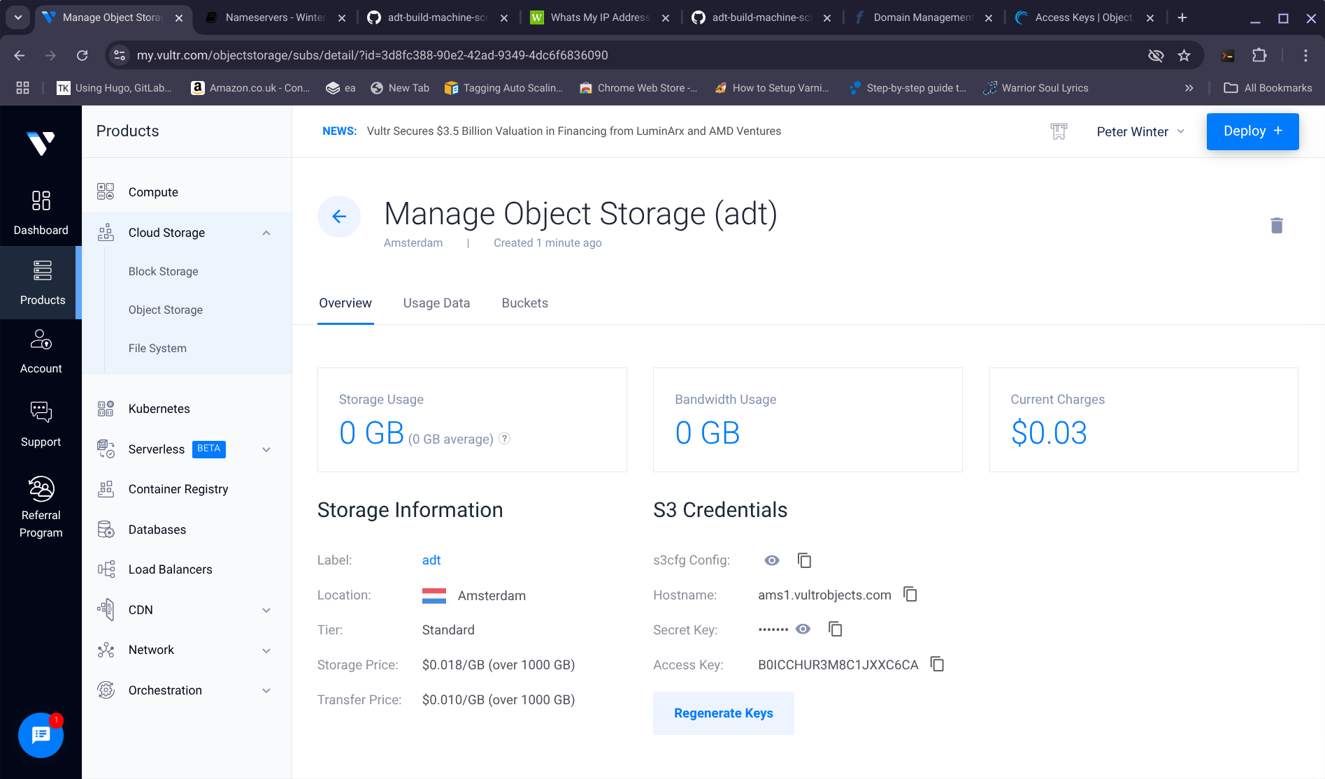 Now record your vultr object storage secret key and your vultr object storage access key in the text file on your laptop